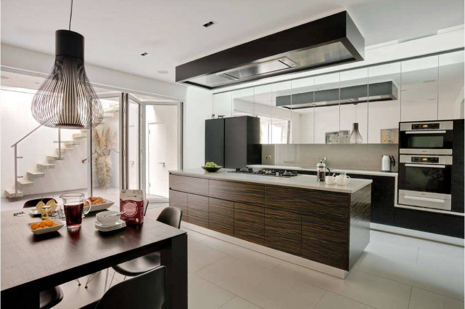 Выбор места для зеркал может быть оригинальным и самым неожиданным. Зеркальный цоколь в основании шкафчиков – нетривиальное решение для обычной кухни.