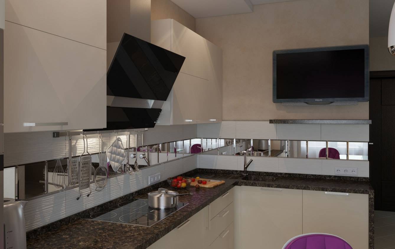 В декоре рабочей зоны используйте зеркальную плитку для фартука кухонного гарнитура. Выбирайте элементы мозаики, маленькие ромбы и квадраты. Перед решением укладки зеркальной плитки на кухне, задумайтесь над работоспособностью вашей вытяжки, плитка быстро потеряет блеск и покроется слоем жира, если вытяжка не справляется с работой.