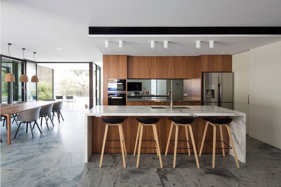 Но существенный недостаток – это маркость, присущая всем глянцевым поверхностям. В данном случае можно подобрать альтернативное и более практичное место для зеркальной поверхности – это фасады кухонного острова.