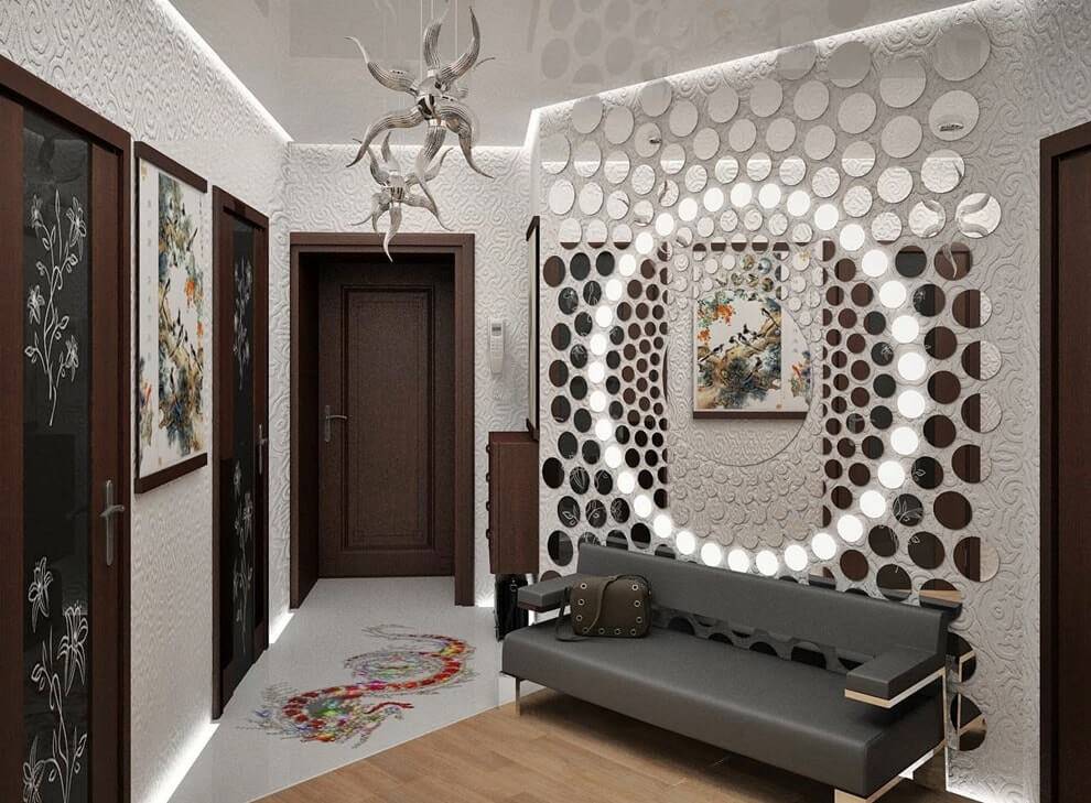 Декоративные зеркальные плитки — отличный способ поднять стандарт узкого коридора. Благодаря изображениям, воспроизведенным в зеркале, интерьер приобретет глубину, покажется шире и просторнее. Если зеркальная плитка в зале будет достаточно большой, и, кроме того, она будет выполнена из стандартного (серебряного) стекла, она успешно заменит обычное зеркало.