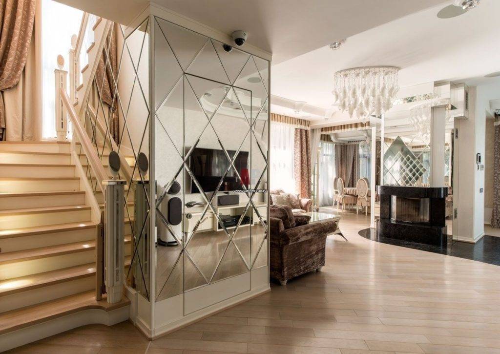 Зеркальное панно в просторной гостиной
