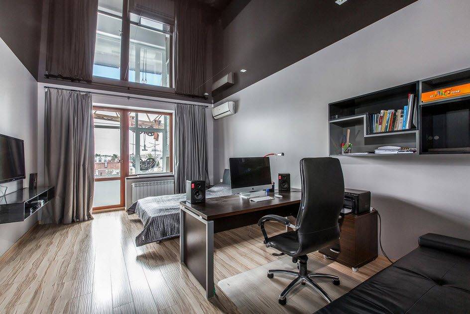 Такой вариант – прекрасный пример того, как с помощью потолка можно подчеркнуть зональность комнаты.