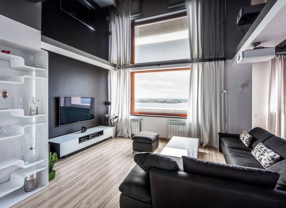 На фото гостиная с белым зеркальным натяжным потолком.