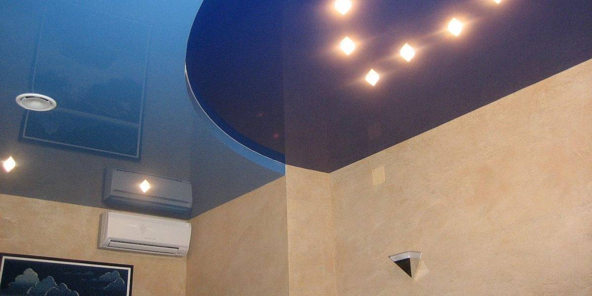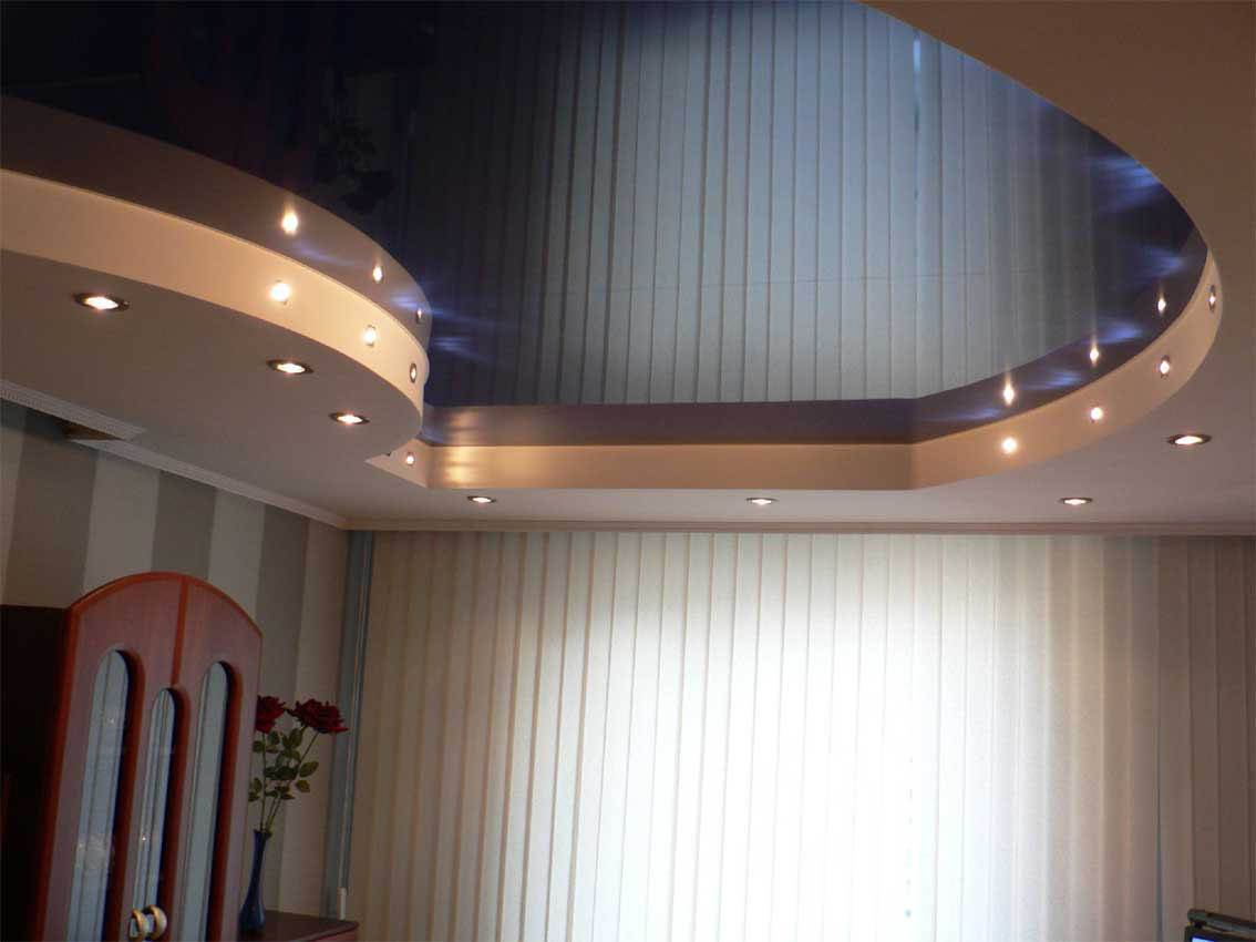 - если ваша конструкция представляет собой двухуровневый “гибрид” подвесного гипсокартонного потолка и натяжного зеркального модуля, то удачным будет решение разместить по периметру гипсокартонной рамы точечные светильники – так потолок будет выгодно подсвечиваться спотами и приобретет нужный объем;