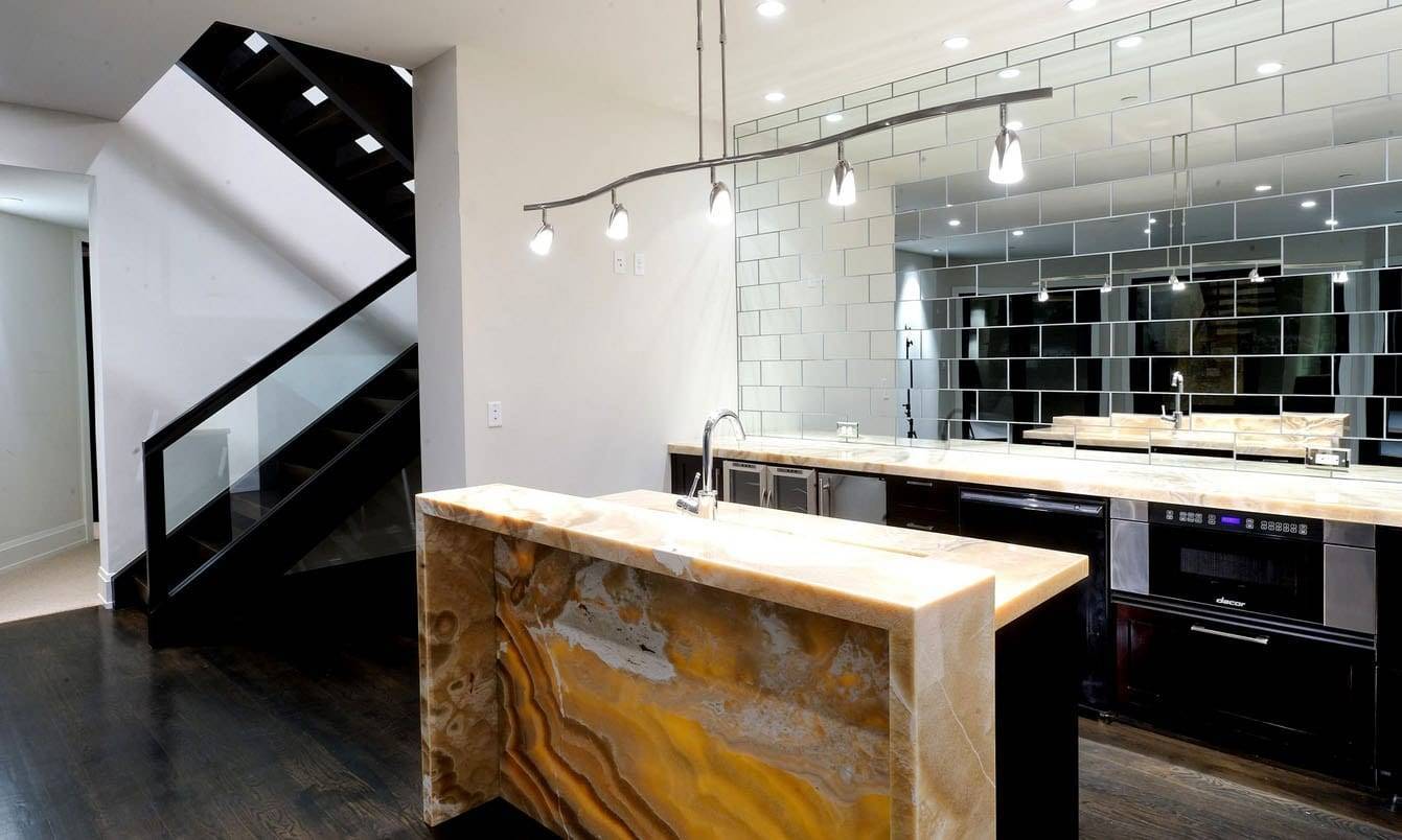 Необычно смотрится кухонный остров, украшенный зеркальными вставками. Такой элемент никогда не останется не заметным. Иногда вместо классической блестящей поверхности используют состаренную или рельефную.