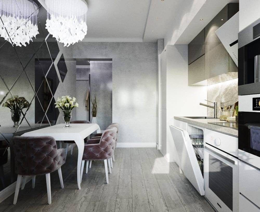 На фото кухня в светлых тонах с гарнитуром, декорированным зеркальными вставками.