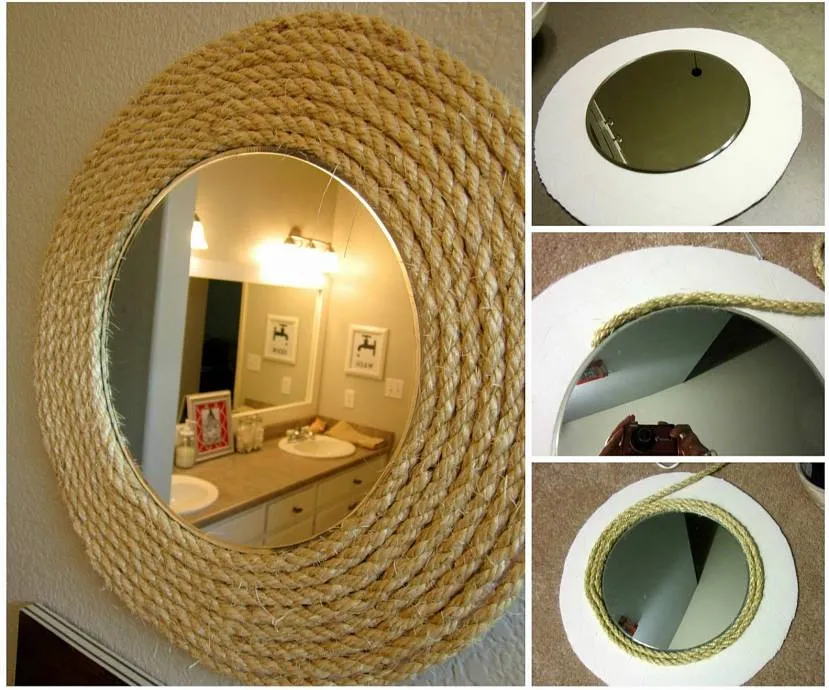 - Канат или веревка. Отличная рамка для овальных и круглых полотен. Ее легко декорировать и окрашивать. Не подходит для обрамления зеркал в ванной и на кухне. Быстро впитывает влагу.