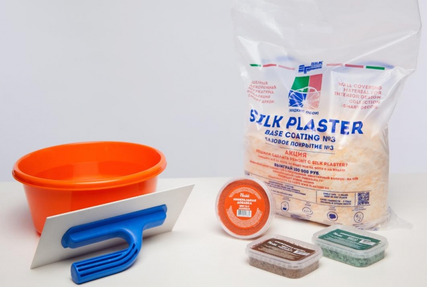 Реализуется в виде сухого порошка, в состав которого входят шелковые и х/б волокна, целлюлоза, различные природные фунгициды, пластификаторы, глиттеры, флоки, слюдянистая и минеральная крошка, специальные красители, а также клеевое связующее вещество. Жидкую консистенцию нужной вязкости смесь приобретает при разбавлении водой. Пропорции зависят от конкретного состава смеси.