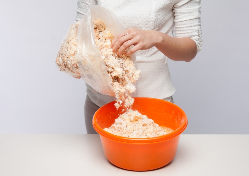 Перемешивать рекомендуется вручную, ведь пользуясь миксером можно нарушить структуру волокон.