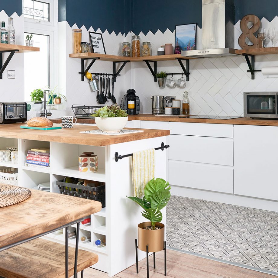 Вы можете применить те же принципы к напольному покрытию. Смещение напольного покрытия будет сигнализировать о переходе между двумя зонами. Это особенно полезно в функциональном пространстве, таком как кухня/столовая.