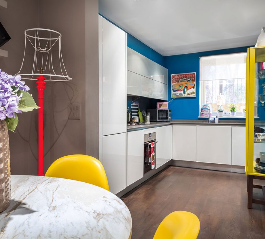 Создать небольшое разделение между пространствами можно так же просто, как взять кисть — в данном случае синюю для кухни и темно-серо-серую для обеденной зоны. Желтые акценты и пол из темного дерева поддерживают визуальную связь, поэтому цветовая гамма не слишком беспорядочна.