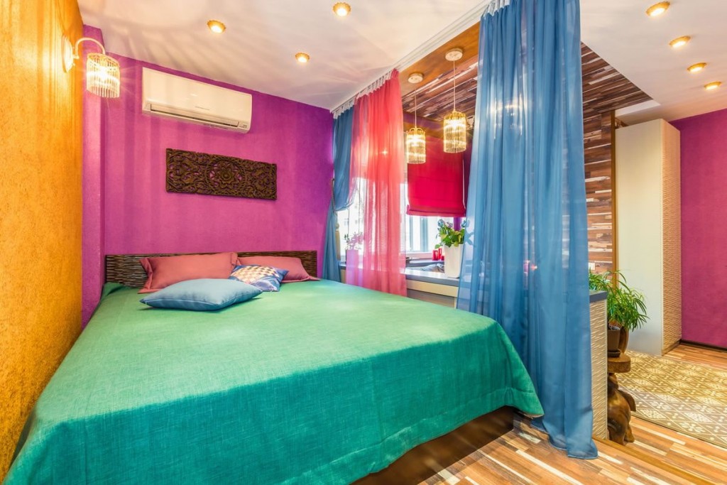 Суть данного подхода очень проста: гостиная и спальня оформляются в разных цветовых гаммах. Но это занятие достаточно сложное, поскольку требуется одновременно добиться и разделения зон, и гармонии оттенков всего помещения.