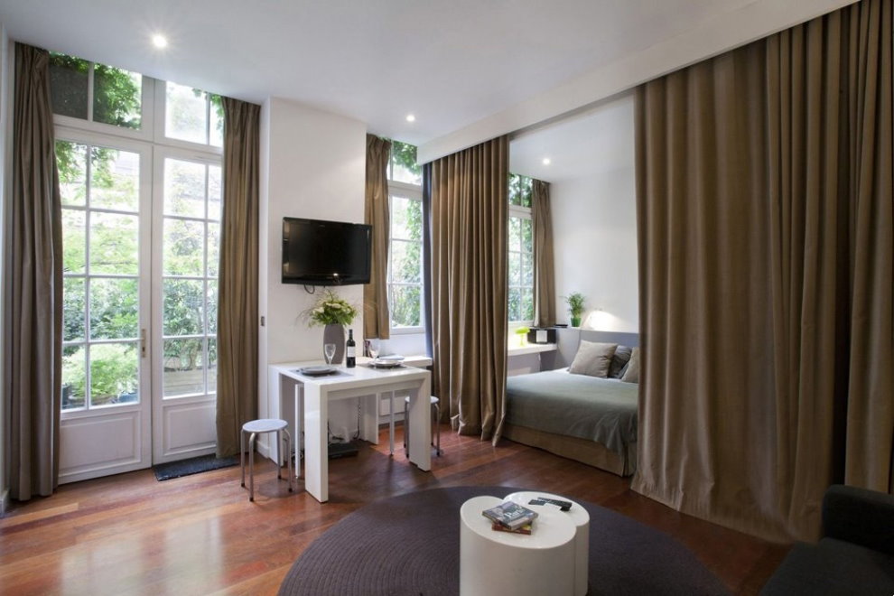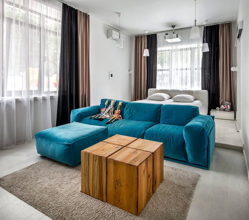 Современный интерьер малогабаритной квартиры с зонирование пространства светонепроницаемой шторой