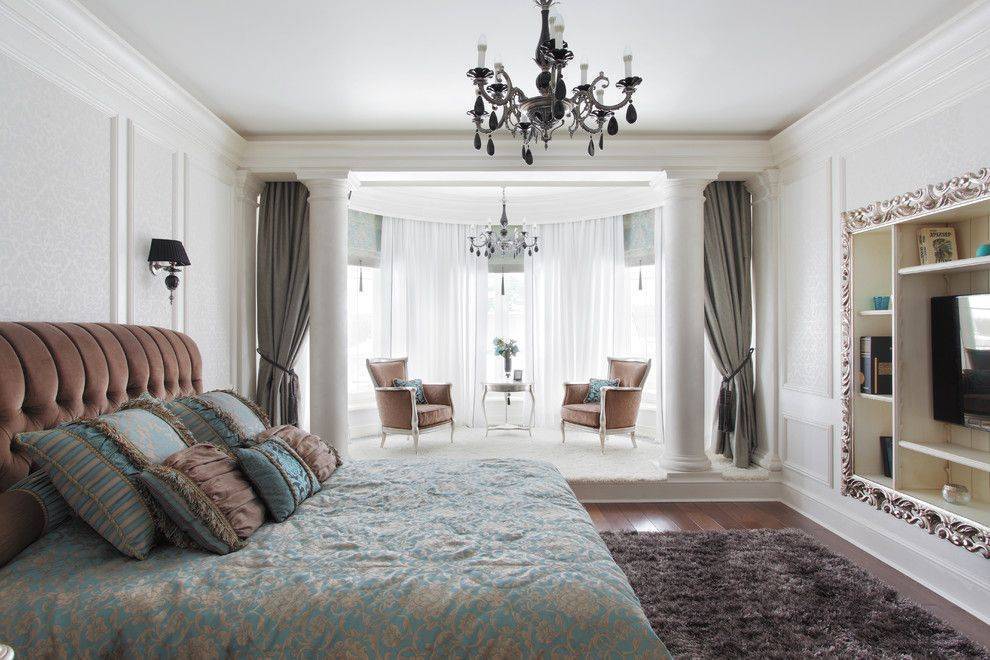 В остальных случаях лучше разделить пространство спальни прозрачными занавесями с красивой драпировкой или частичной сборкой снизу. Органично смотрится обособленный будуар и гардеробная за шторами.