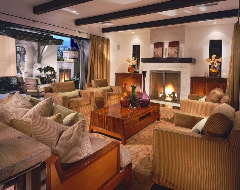 - Для шикарного модерна используется дорогой текстиль с благородно-приглушенным флористичным орнаментом. В зонированной гостиной они станут центром притяжения.