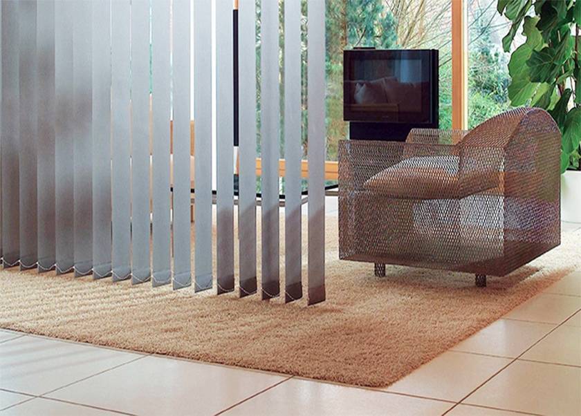 - Вертикальные жалюзи. Повторяют тип оконных сооружений, только длиннее, по размеру ламели подогнаны к конкретным проемам. Собираются с помощью нити.