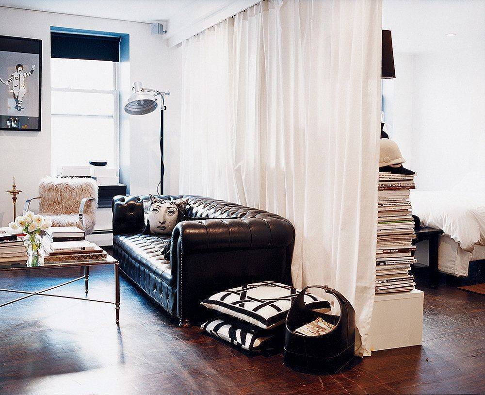 Квартира-студия — это целое пространство для реализации интересных дизайнерских решений творческих людей. Он находится в таком помещении, что на первый план выходит вопрос о зонировании. А если у вас не хватает бюджета, чтобы поставить дизайнерскую перегородку, лучшим решением в этом случае станут шторы, эстетика которых не уступает предыдущей.