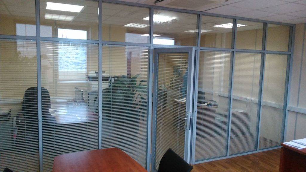 Нестандартный способ использования – крепление жалюзи на прозрачный дверной профиль. Решение популярно для обустройства офисов. Если в помещении предусмотрена стеклянная перегородка, жалюзи вешают и на нее.