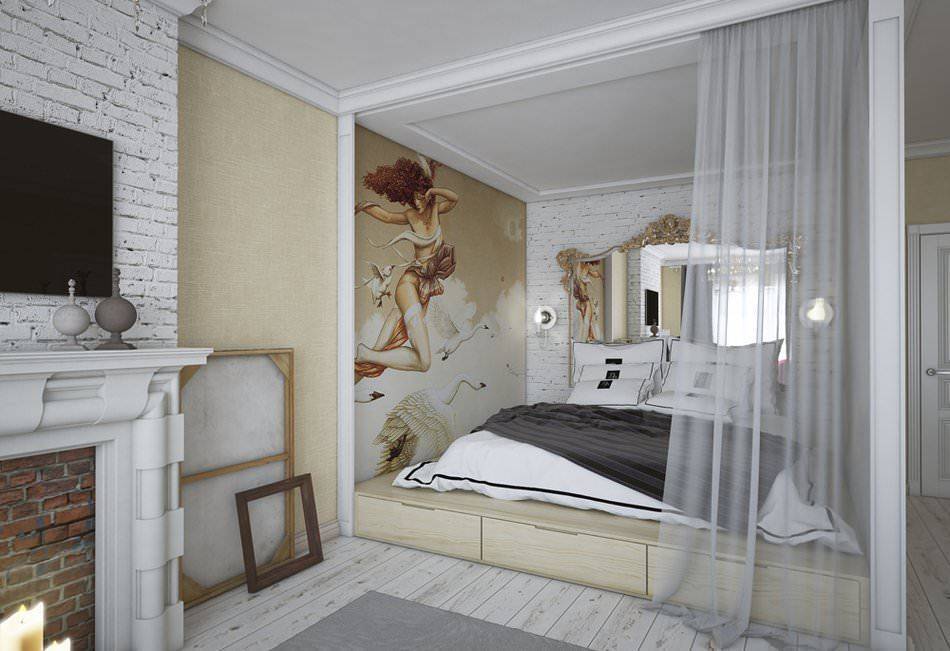 - кровать – отделяется балдахином либо прозрачными тканями. Можно использовать и плотные портьеры, но только если ваш интерьер в соответствующей стилистике. В дизайнах хай-тек или модерн кровать не обрамляется;