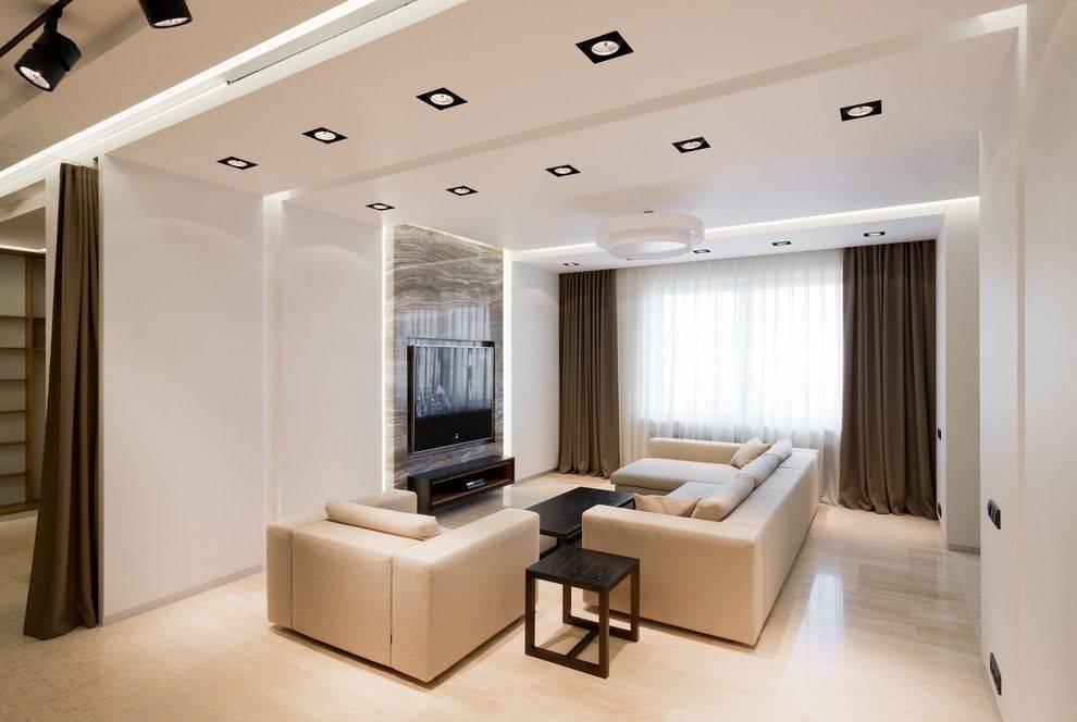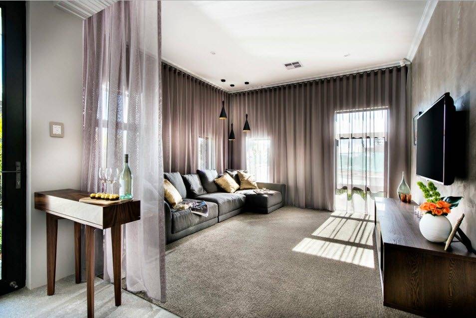 Почему в гостиной стоит установить дополнительный карниз? Во-первых, если это однокомнатная квартира, текстиль поможет разграничить площадку без значительных материальных и физических вложений. Жильцы обретут желаемое уединение, а когда появится повод – раскроют занавеси и получат просторное место для совместного досуга. Зонирование гостиной шторами может быть выполнено со следующими целями: