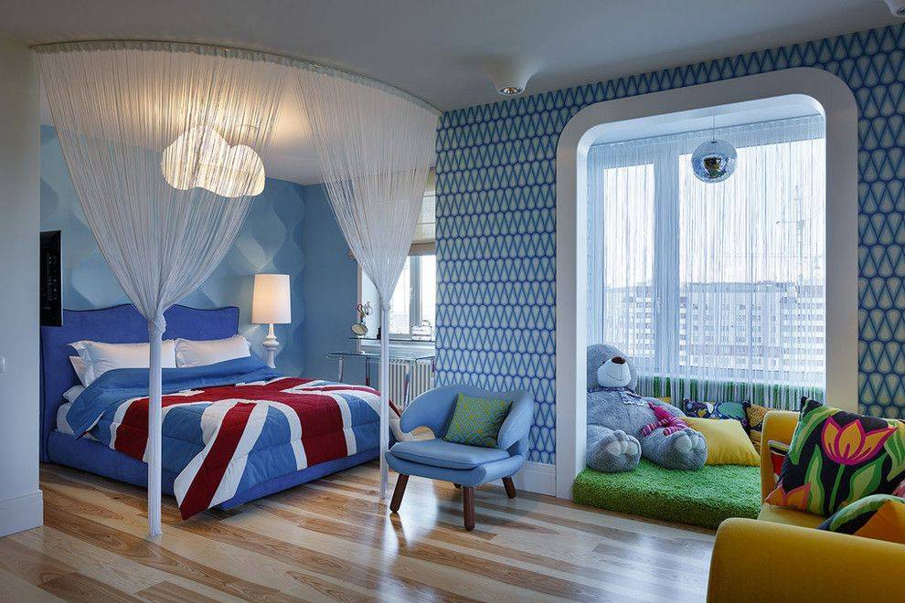 Можно сосредоточиться на зоне сна и выделить шторами кроватку. Мальчишкам точно понравится засыпать, разглядывая необычные летающие объекты, изображенные на пологе. Девочки скорее предпочтут пышные балдахины, делающие даже из самой простенькой кровати ложе, вполне достойное юных принцесс.